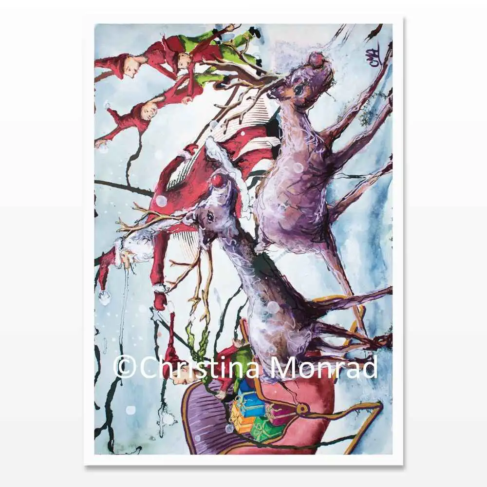 Det originale motiv “Sneboldkamp inden afgang” er malet med tusch, akvarel og akrylmaling af Christina Monrad.