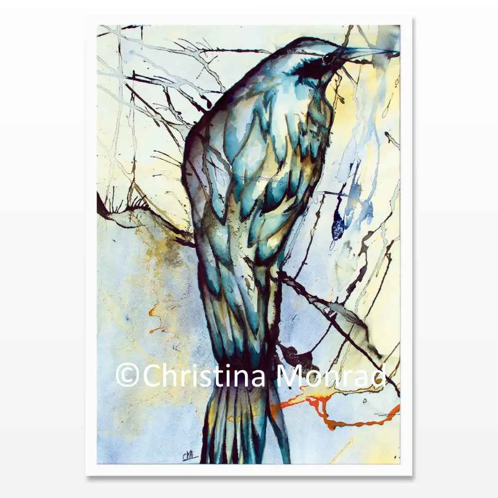 Det originale motiv “Fugl, jeg ser dig” er malet med tusch, akvarel og akrylmarkere af Christina Monrad.