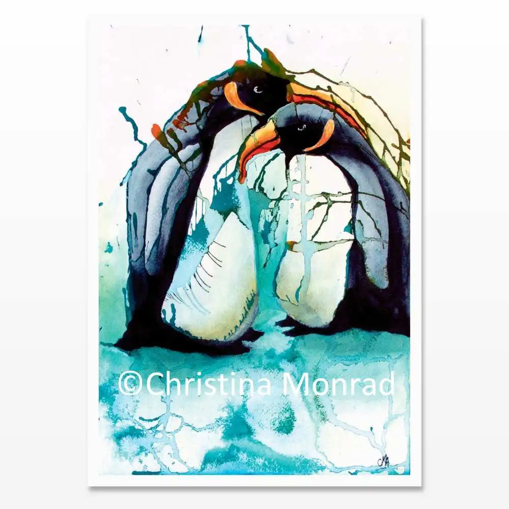Det originale motiv “Pingviner i parforhold” er malet med tusch, akvarel og akrylmarkere af Christina Monrad.