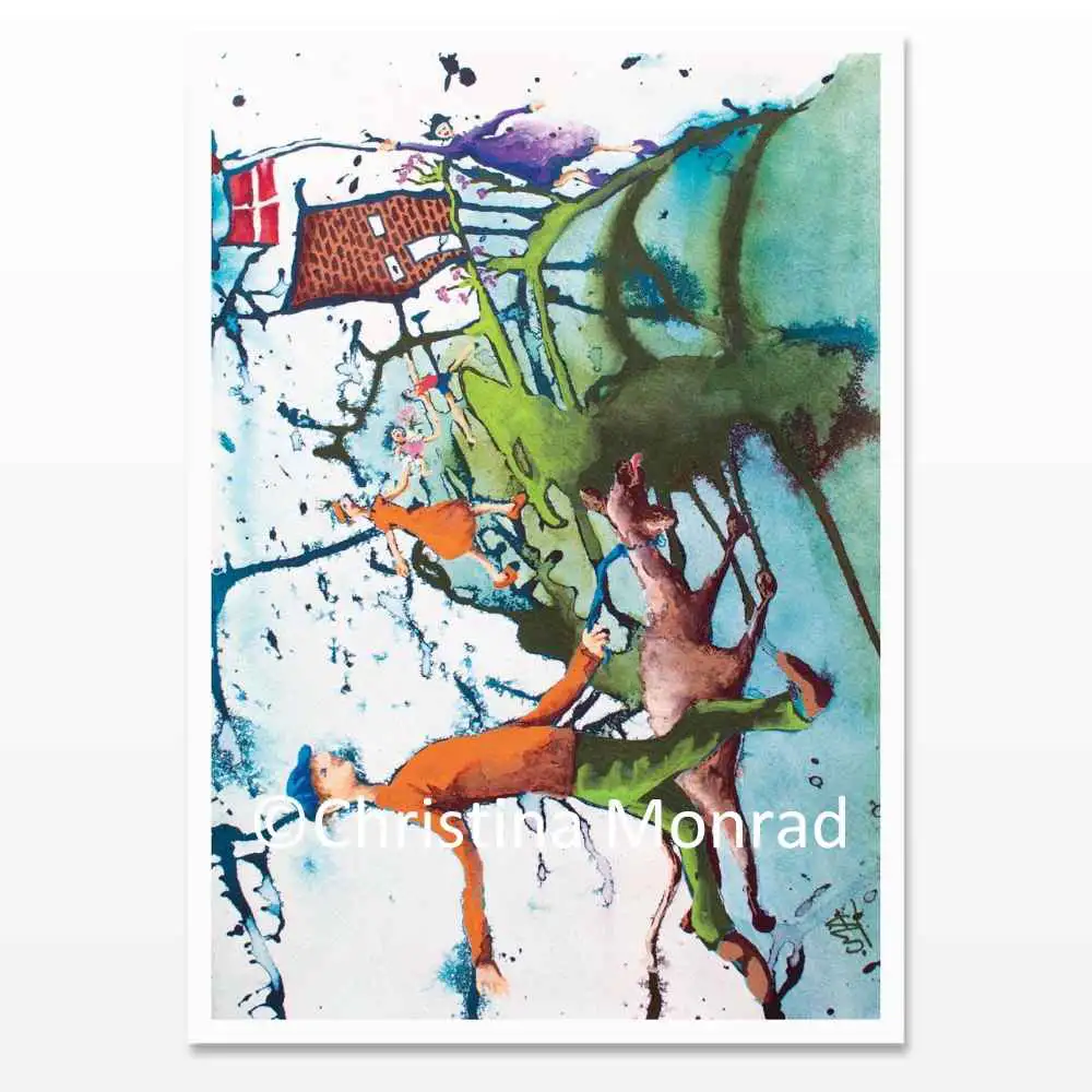 Det originale motiv “Familien kommer” er malet med tusch, akvarel og akrylmarkere af Christina Monrad.