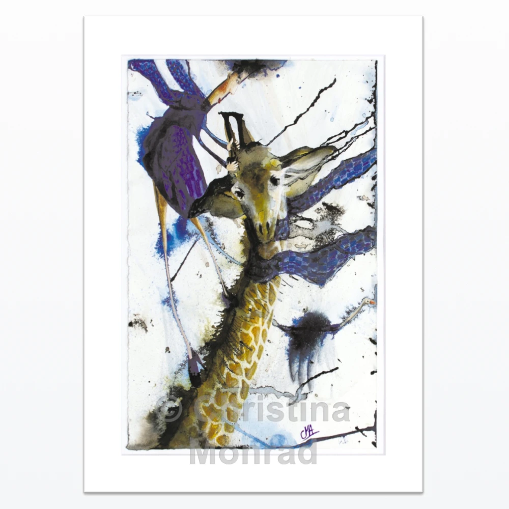 A3 plakat af billedet “Giraf med passager” af Christina Monrad. Originalen er malet som “tusch-ballade” – med flydende tusch og akvarel på akvarelpapir.