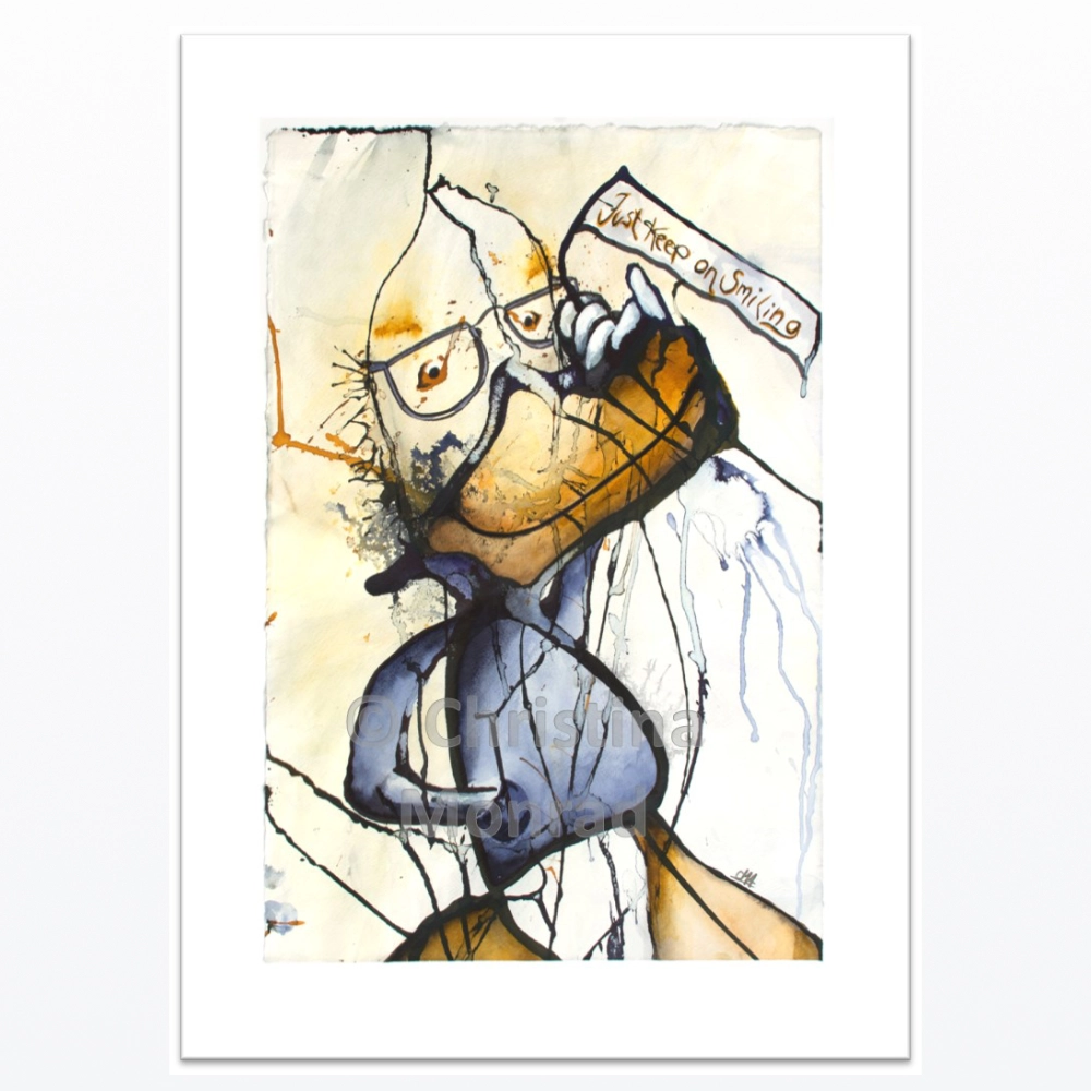 A3 tryk af billedet “Just keep on smiling” af Christina Monrad. Originalen er malet med flydende tusch og akvarel på papir.