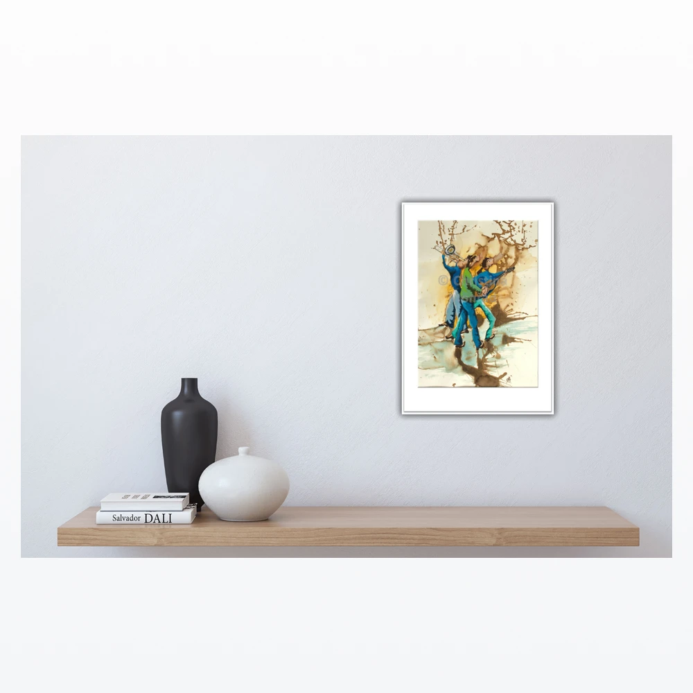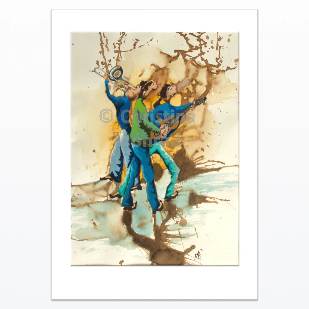 A3 tryk af billedet “Kaffemusikanter” af Christina Monrad. Originalen er malet med kaffe, akrylmarkere og akvarel på akvarelpapir.