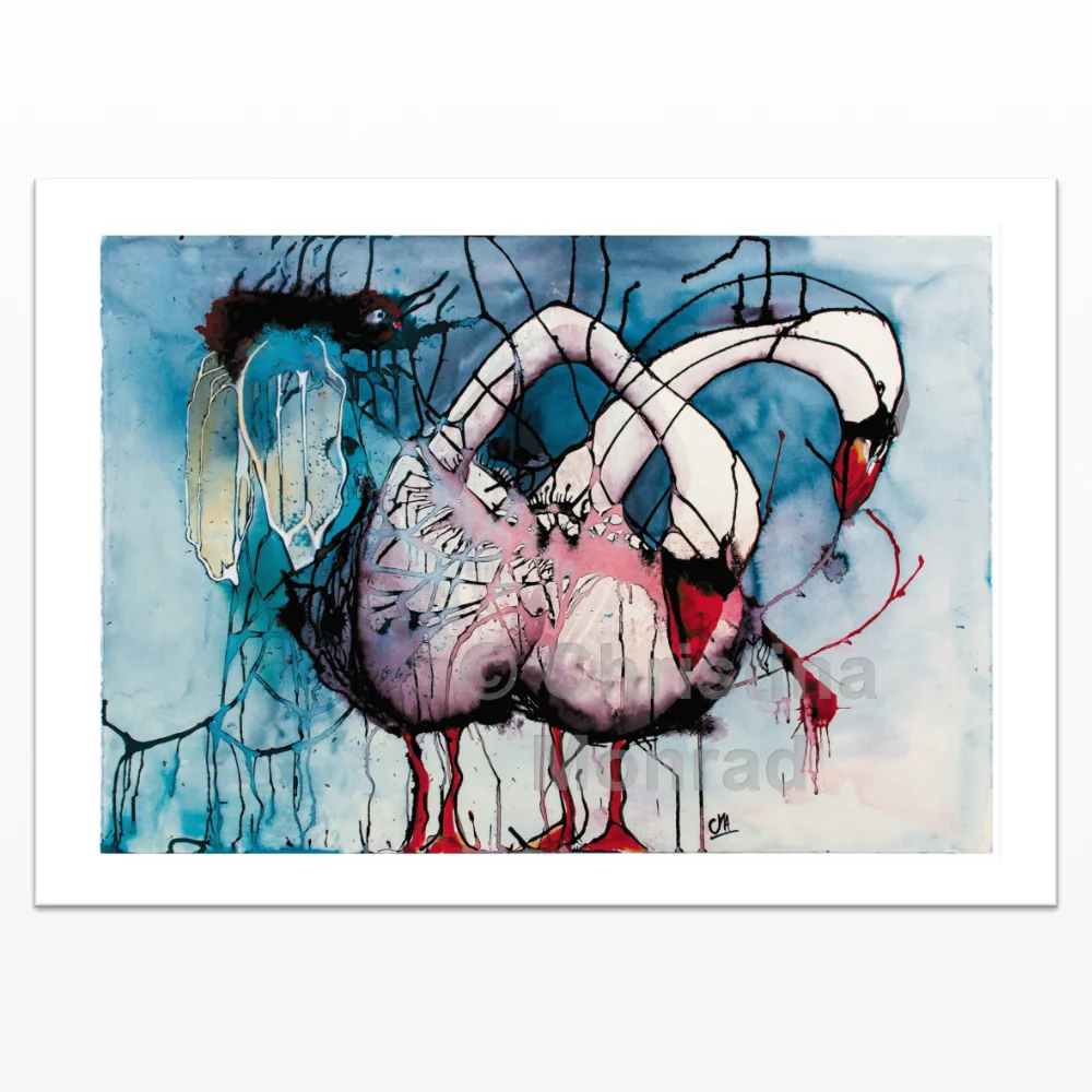 Plakattryk af billedet “Svanernes nye ven” af Christina Monrad. Originalen er malet med flydende tusch og akvarel på akvarelpapir.