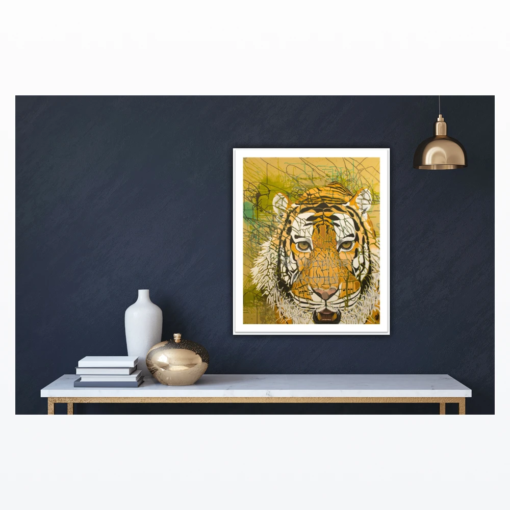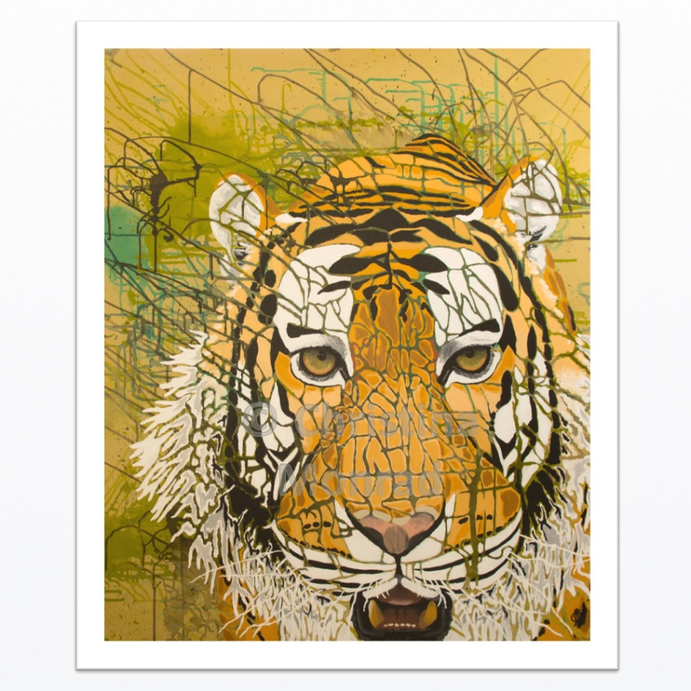 Plakattryk af maleriet “Tiger på godt og ondt”. UV print på 210 g. Hahnemühle papir. Originalen er malet af Christina Monrad med akrylmaling og flydende tusch på lærred.